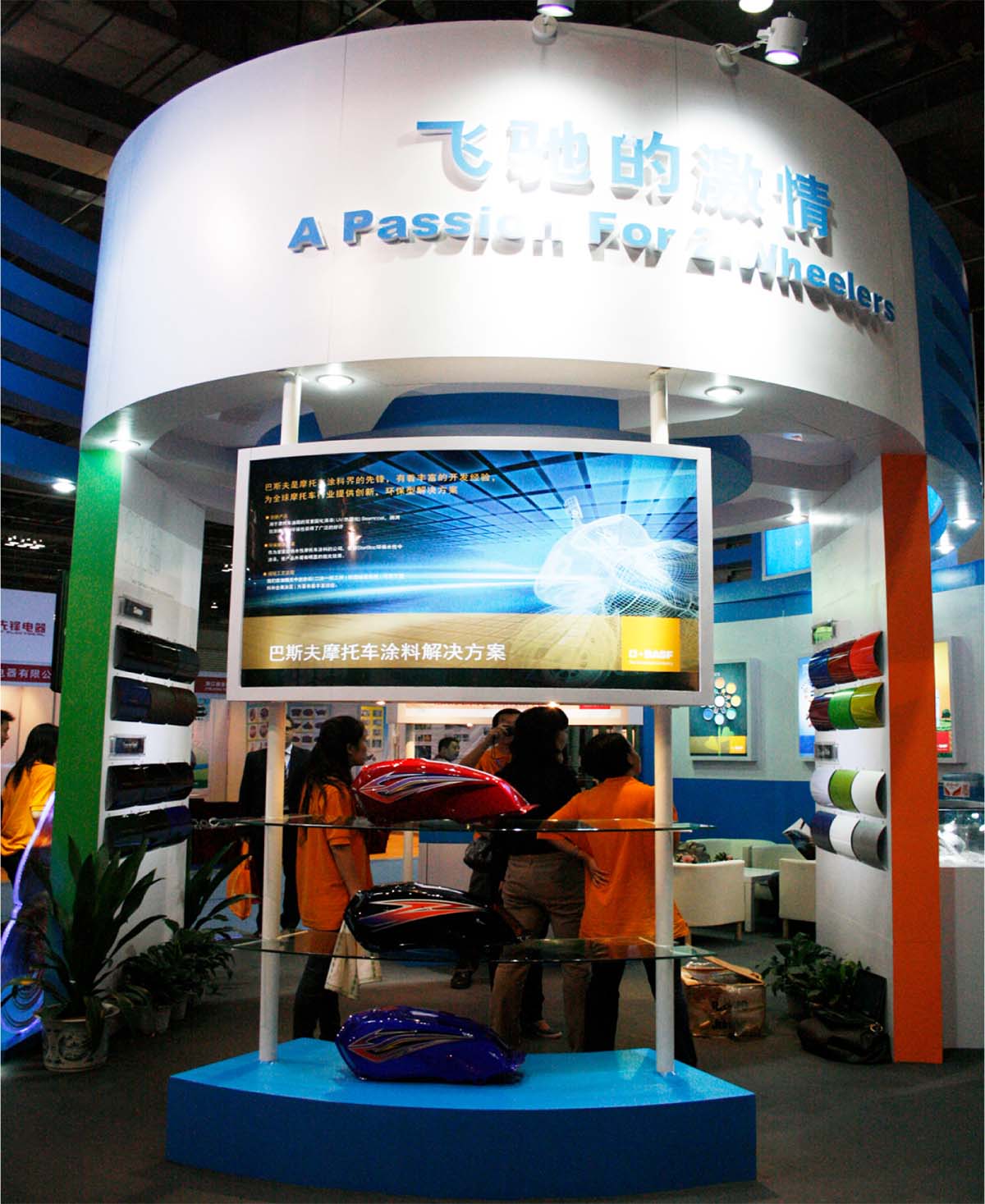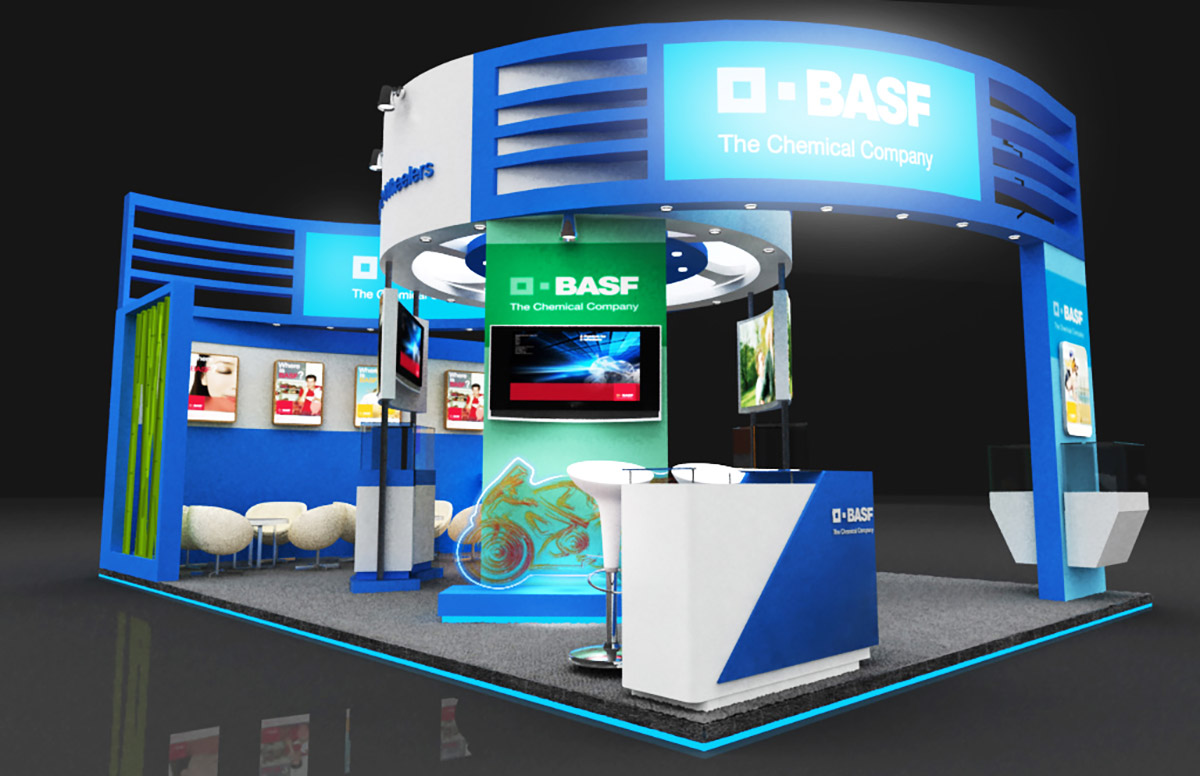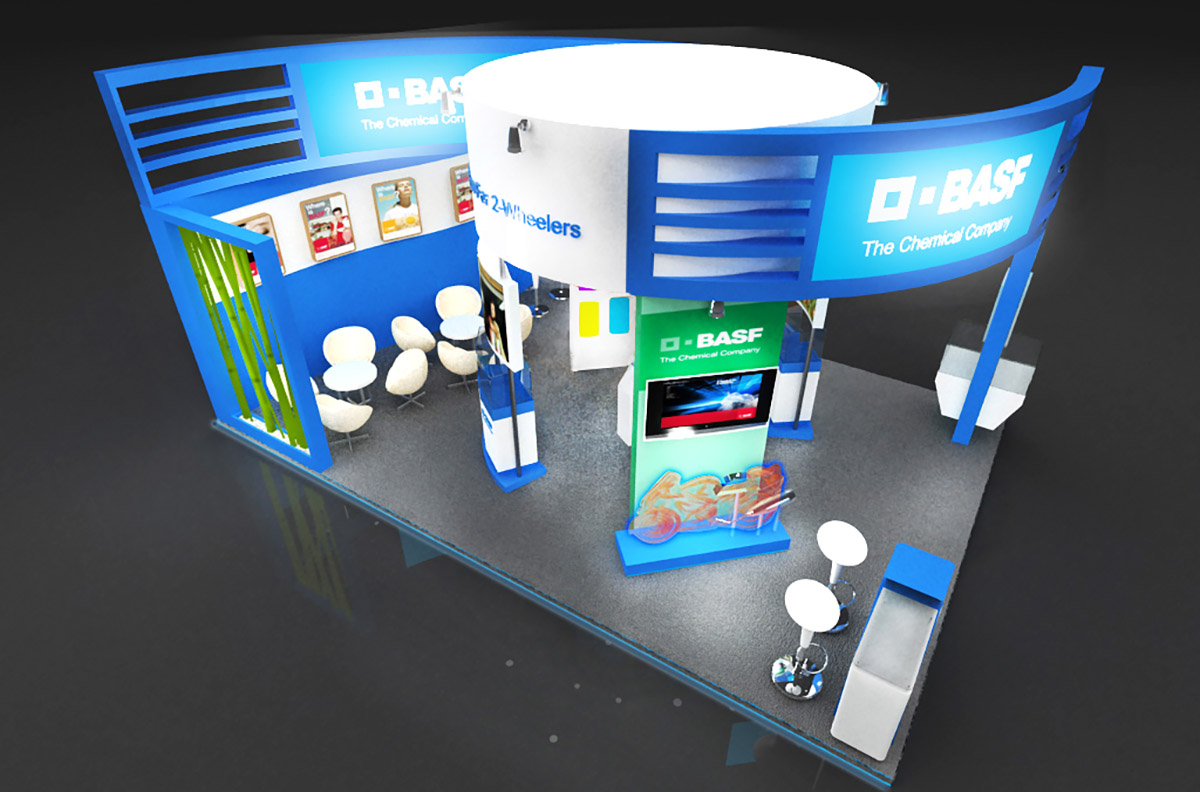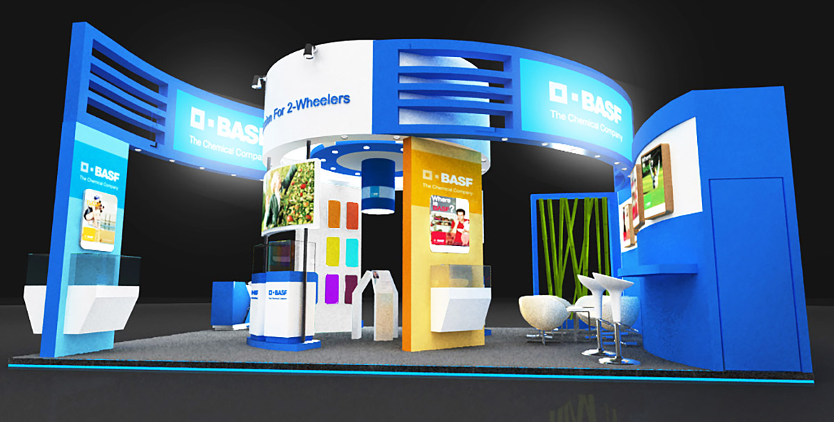此次由巴斯夫摩托車(chē)部門(mén)參展,展臺(tái)以摩托車(chē)的速度和動(dòng)感為主要設(shè)計(jì)元素,也是BASF公司第一次用圓形為展臺(tái)主基調(diào),富有動(dòng)感的展臺(tái)效果也得到了BASF公司的認(rèn)同和好評(píng)。