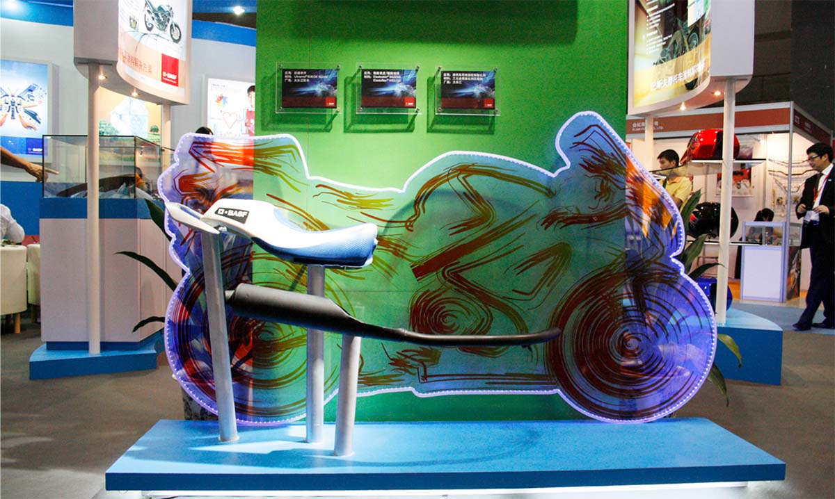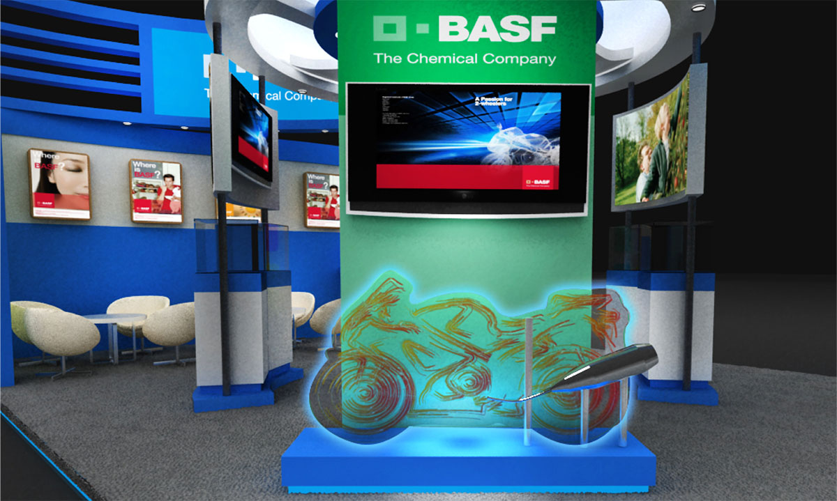 巴斯夫摩托車(chē)部門(mén)參加CIMAMotor展會(huì),展臺(tái)以摩托車(chē)的速度和動(dòng)感為主要設(shè)計(jì)元素,也是BASF公司第一次用圓形為展臺(tái)主基調(diào),富有動(dòng)感的展臺(tái)效果也得到了BASF公司的認(rèn)同和好評(píng)。